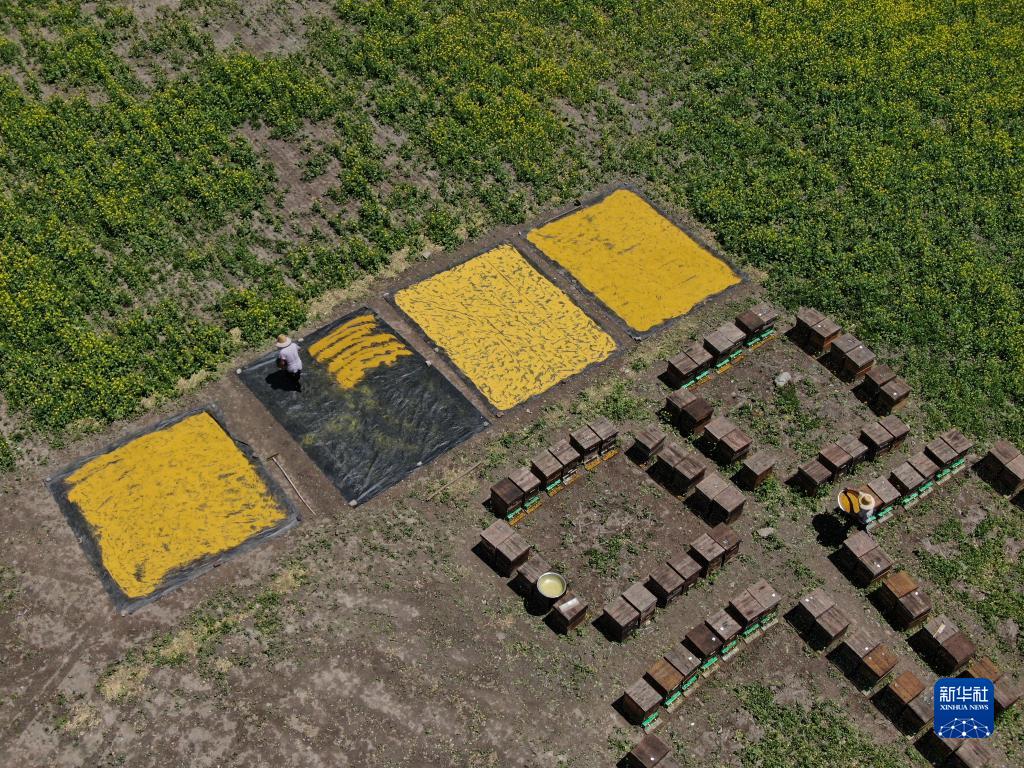 7月2日,在青海省海北藏族自治州门源回族自治县,冯跃宣在晾晒花粉(无人机照片)。