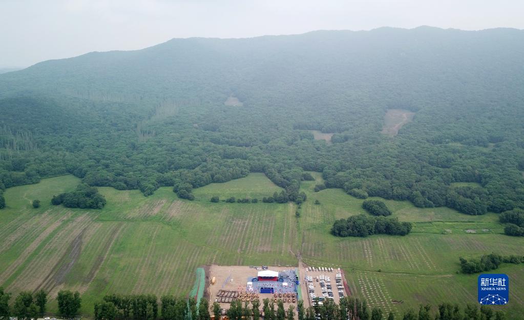 这是7月5日拍摄的国网黑龙江尚志抽水蓄能电站开工动员大会现场,这里未来将成为电站项目的施工作业区(无人机照片)。