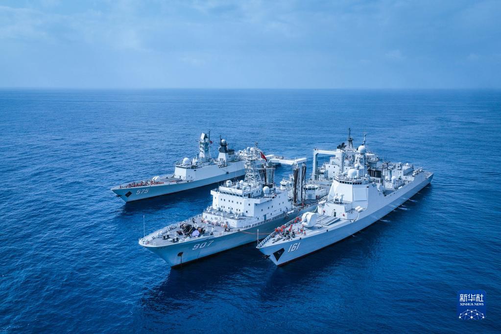 中国海军第40批护航编队骆马湖舰(中)同时为岳阳舰(左)、呼和浩特舰进行补给(2月27日摄)。