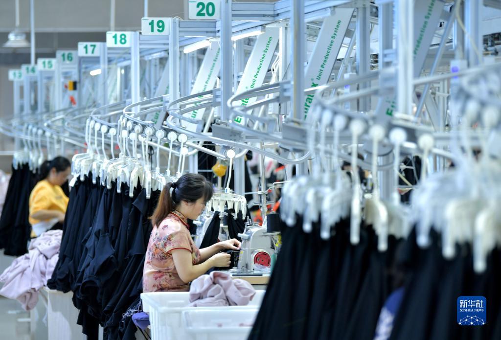 7月5日,工人在宣恩县高罗镇一服饰企业生产线上忙碌。