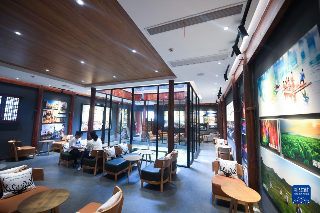 7月5日,游客在河桥古镇老街上的小镇客厅里休息。