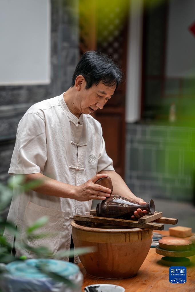 紫陶艺人徐荣洪在院落里对紫陶工艺品进行无釉磨光(6月30日摄)。