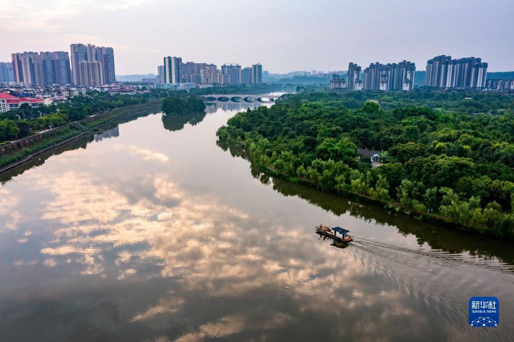6月24日清晨,工作人员驾驶小船清理眉山东坡城市湿地公园湖泊中的垃圾(无人机照片)。