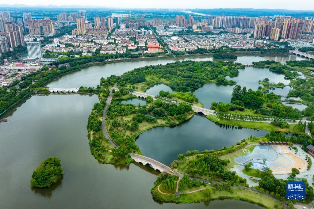 这是无人机拍摄的眉山东坡城市湿地公园和周边建筑群(6月23日摄)。