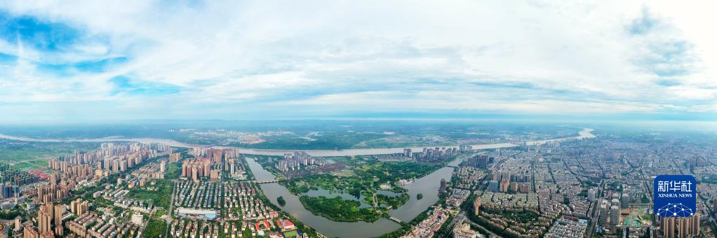 这是无人机拍摄的眉山东坡城市湿地公园全景(中)和周边建筑群(6月23日摄)。