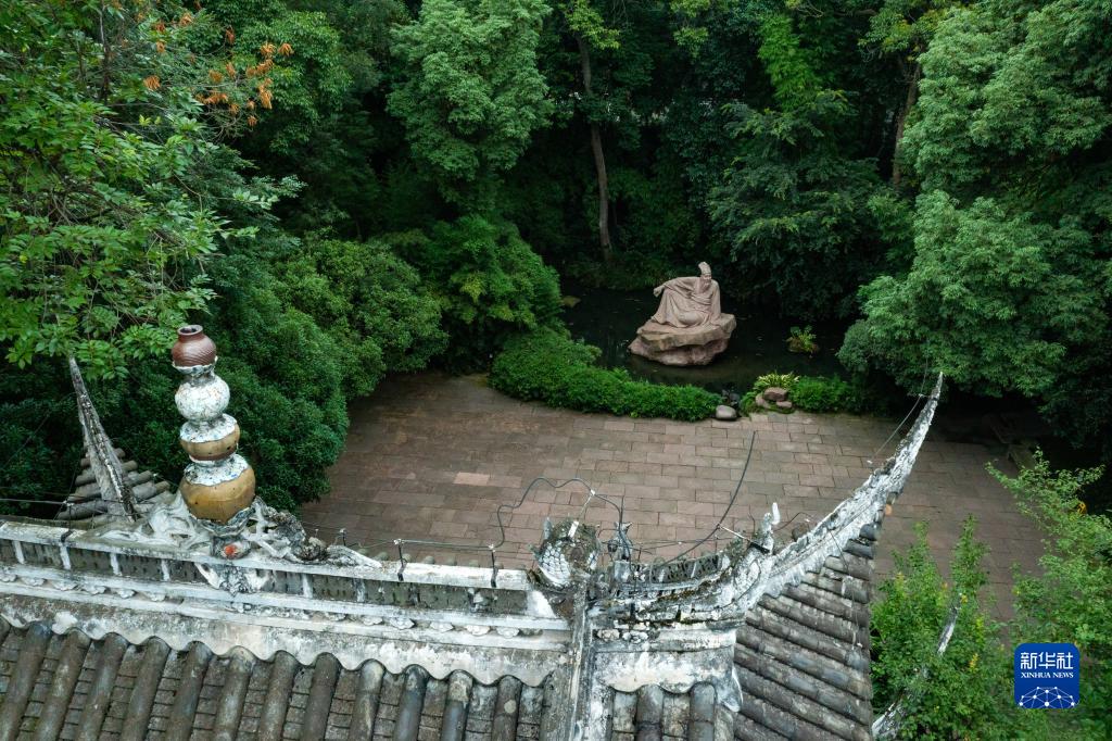 这是无人机拍摄的眉山三苏祠内的东坡盘陀坐像(上)和披风榭(6月22日摄)。