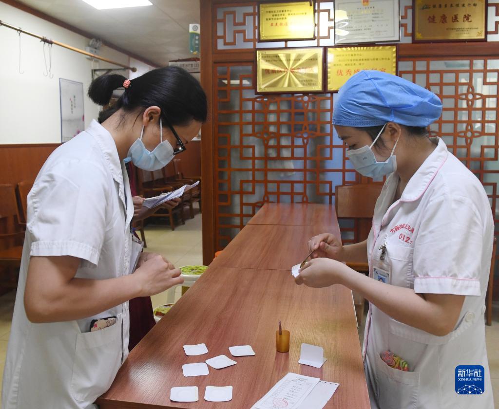7月6日,在广西南宁市青秀区方园社区卫生服务中心,医务人员在配药准备为市民贴“三伏贴”。