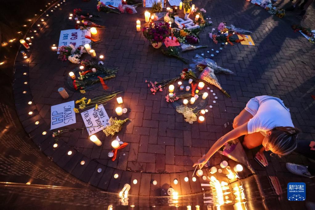 5日,人们在伊利诺伊州海兰帕克市悼念“独立日”枪击案遇难者。海兰帕克市警方当日在记者会上说,“独立日”枪击案中的死亡人数升至7人,另有46人受伤。