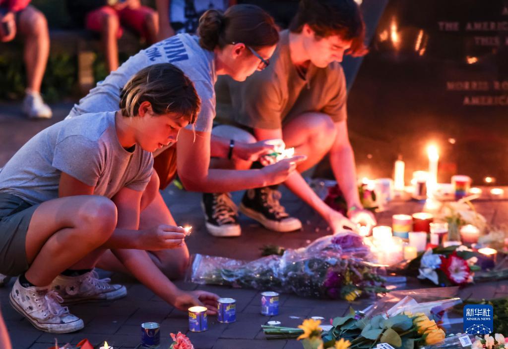 5日,人们在伊利诺伊州海兰帕克市悼念“独立日”枪击案遇难者。海兰帕克市警方当日在记者会上说,“独立日”枪击案中的死亡人数升至7人,另有46人受伤。