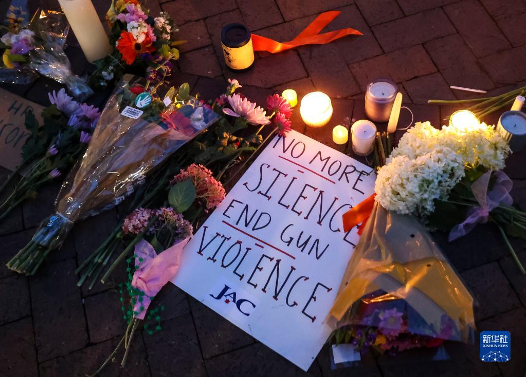 5日,人们在伊利诺伊州海兰帕克市悼念“独立日”枪击案遇难者。海兰帕克市警方当日在记者会上说,“独立日”枪击案中的死亡人数升至7人,另有46人受伤。