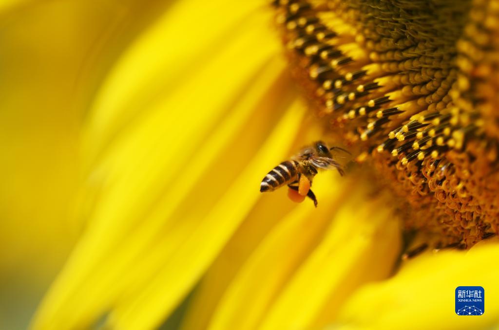 在云南省丽江市玉龙县,一只蜜蜂在向日葵上采蜜(7月2日摄)。
