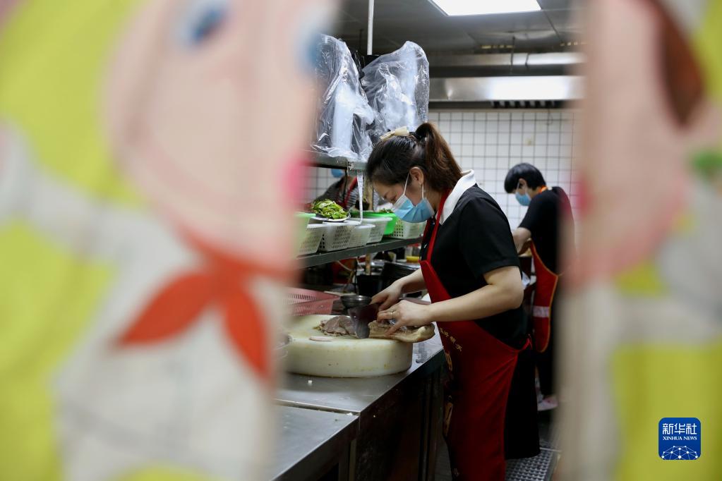 7月4日上午,陶虹宏(左)在厨房里帮忙切配,为午饭时段做准备。