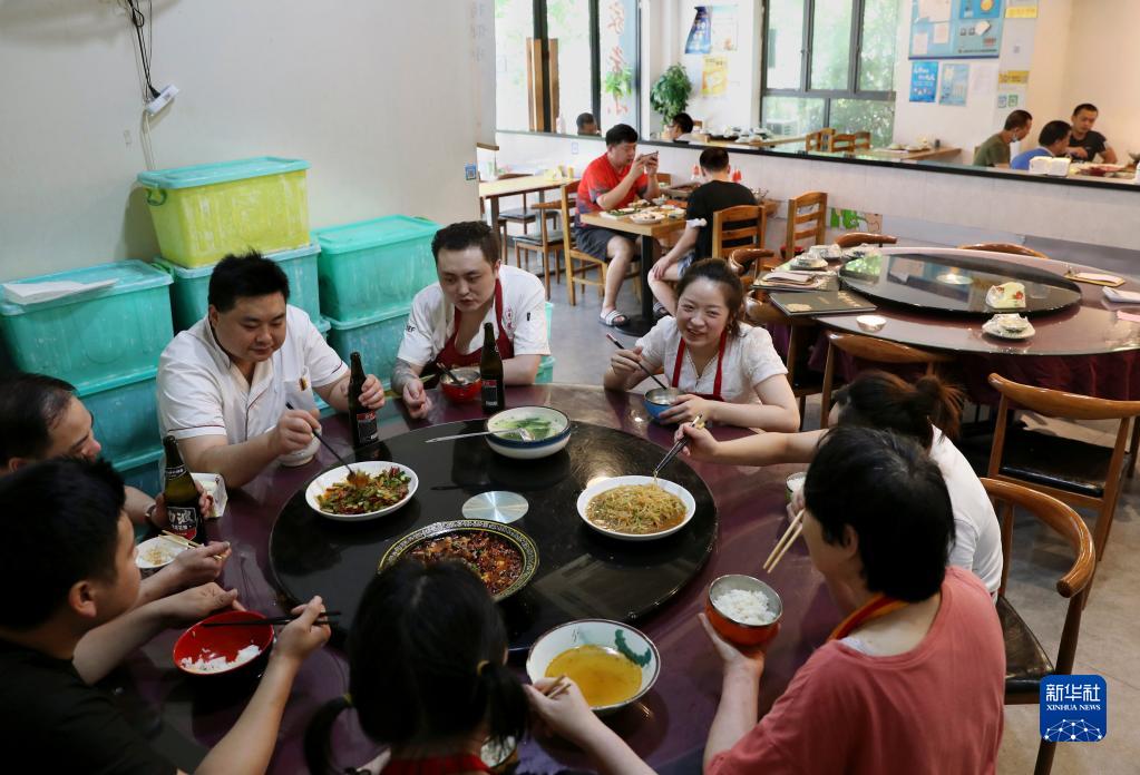 7月5日,陶虹宏(前中)和员工一起吃午饭。店内员工都是陶虹宏夫妇在重庆市开州区赵家街道的同乡,5年前随他们一同来上海打拼至今。