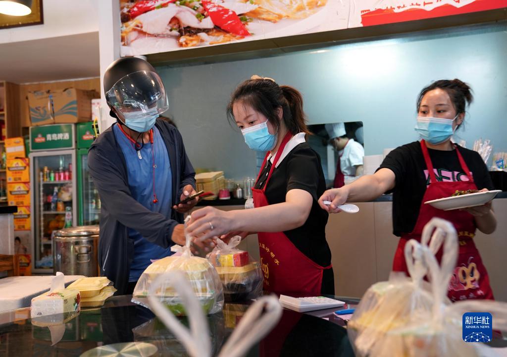 7月4日,陶虹宏(中)将外卖交给订餐平台的外卖配送员。