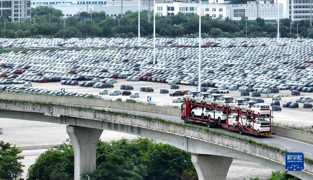 7月6日,满载新能源汽车的货车从广西柳州汽车城一物流基地旁经过(无人机照片)。新华社发(黎寒池摄)