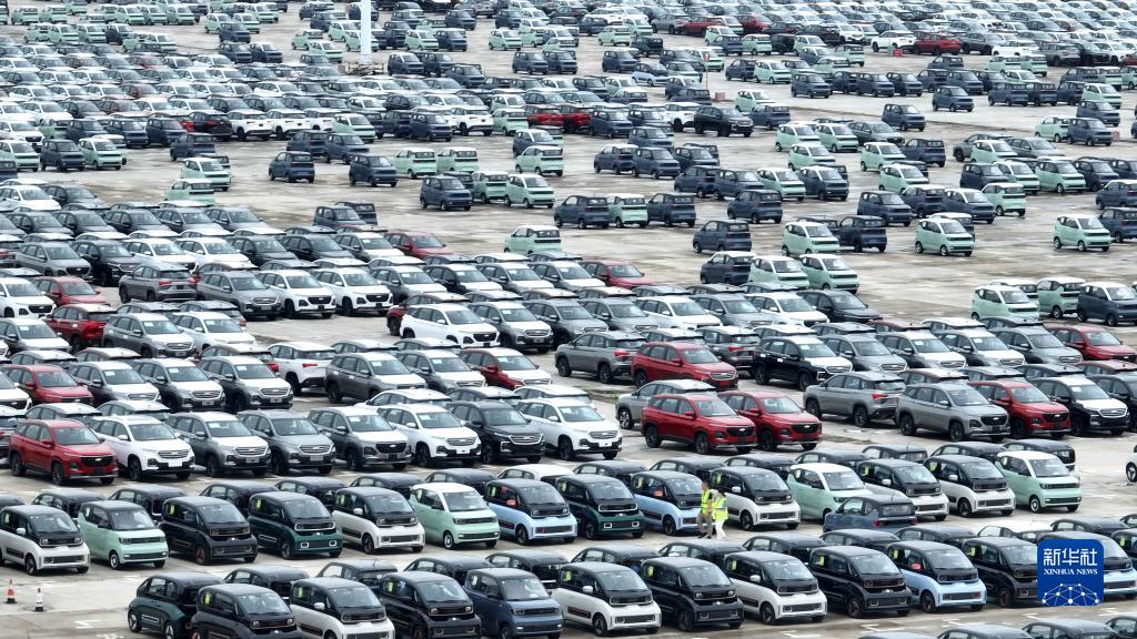 7月5日,在广西柳州汽车城一家商品车物流基地,工人检查即将发运的的新能源汽车(无人机照片)。新华社发(黎寒池摄)
