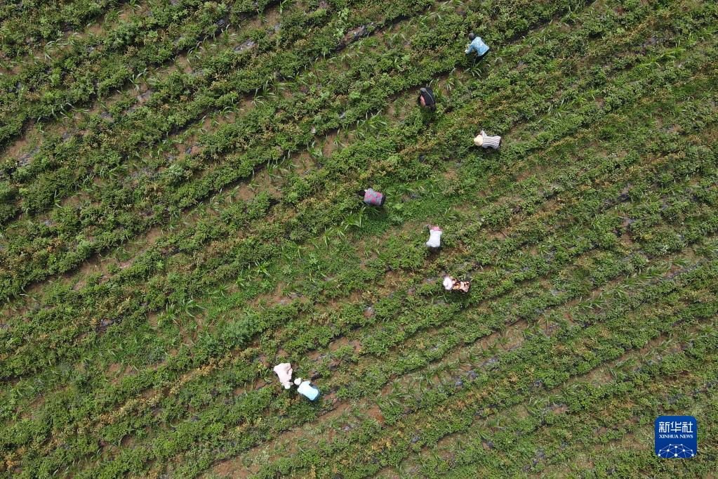 7月6日,在河北省临城县黑城镇石固村,农民在管理草红花和丹参(无人机照片)。