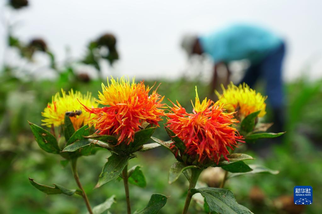 7月6日,在河北省临城县黑城镇石固村,农民在管理草红花。