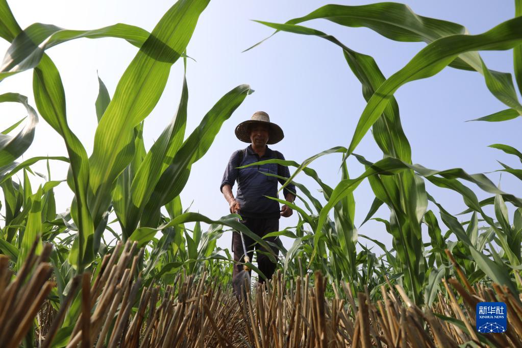 7月6日,河南省焦作市温县黄河街道朱家庄村村民在玉米田间喷洒灭草剂。