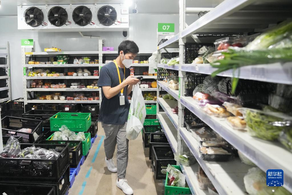 吴任华在美团买菜逸仙路站点内分拣货品(7月5日摄)。