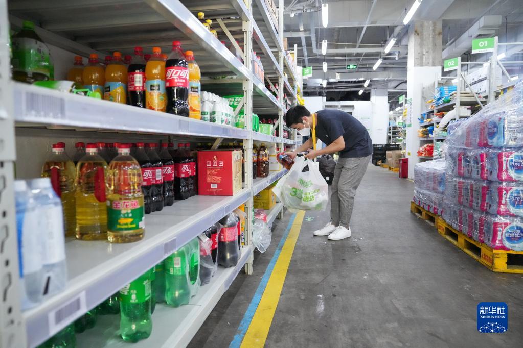 吴任华在美团买菜逸仙路站点内分拣货品(7月5日摄)。新华社记者 丁汀 摄