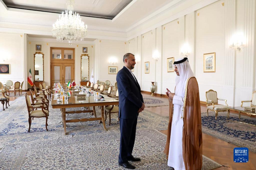 7月6日,在伊朗外长阿卜杜拉希扬(左)在德黑兰与到访的卡塔尔副首相兼外交大臣穆罕默德交谈。
