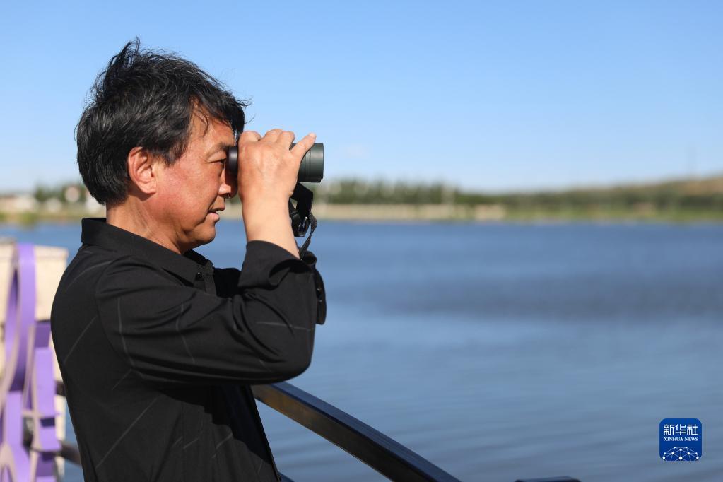 7月6日,在河北省张家口市康保县康巴诺尔国家湿地公园,麻喜荣在观测野生鸟类。