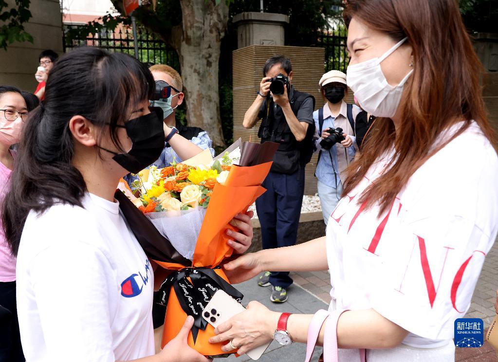 7月7日,在上海市静安区市西中学门口,一名考生家长(右)为完成首场考试的女儿送上鲜花。