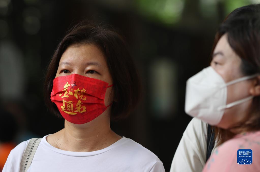 7月7日,在上海市南洋模范中学考点,一名送考家长戴着“金榜题名”字样的口罩等候。