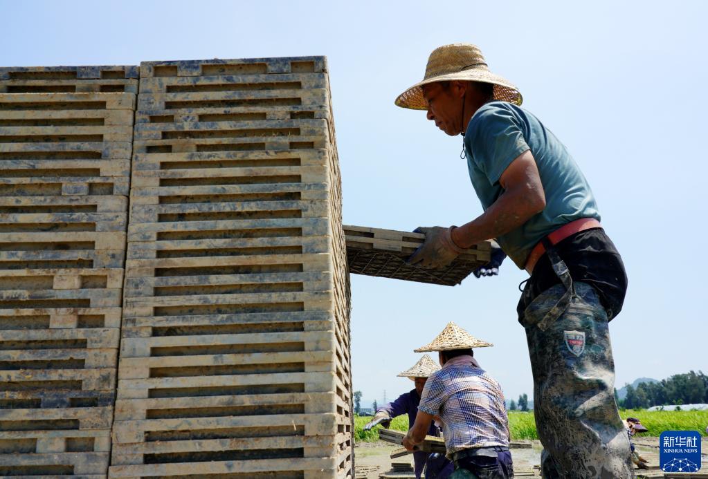 7月7日,农民在浙江省乐清市城东街道振海村的秧田搬运秧盘。