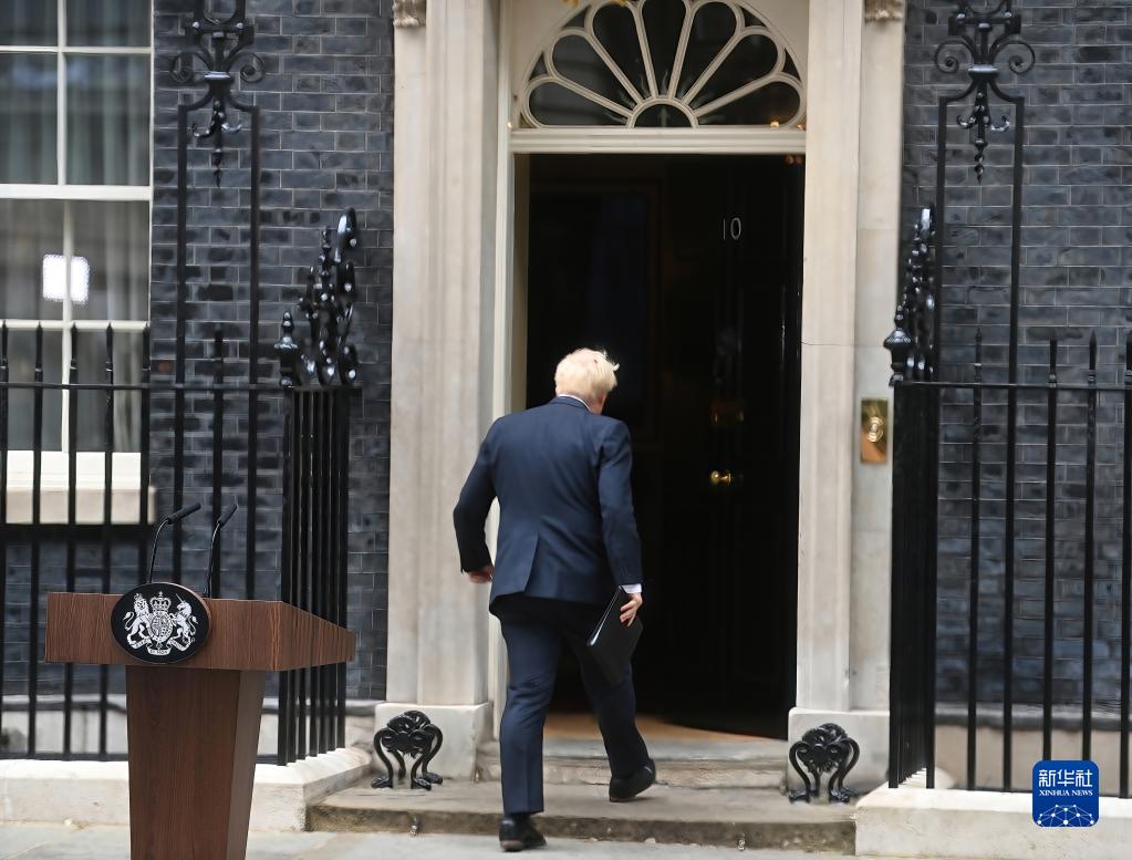 7月7日,英国首相鲍里斯·约翰逊在伦敦唐宁街10号门前发表讲话后返回室内。 新华社记者 李颖 摄