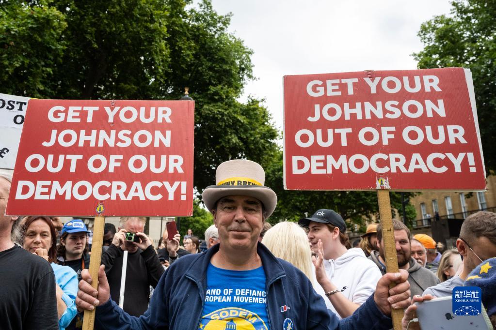 7月7日,在英国伦敦唐宁街10号外,鲍里斯·约翰逊的反对者手持标语。 新华社发(史蒂芬·程摄)