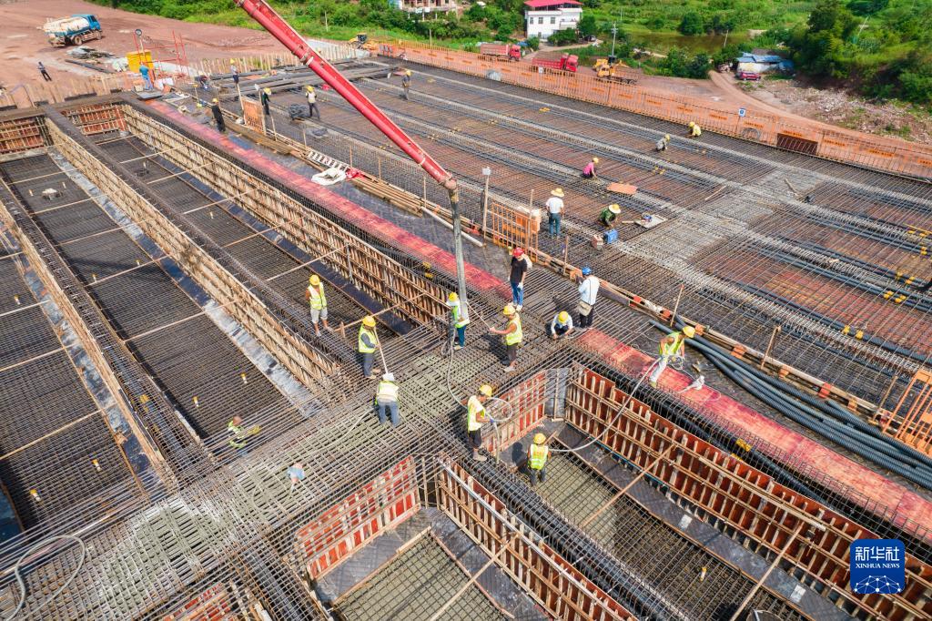 7月8日,在衡永高速祁东东枢纽互通娄衡跨线桥建设现场,工人们在浇筑箱梁(无人机照片)。