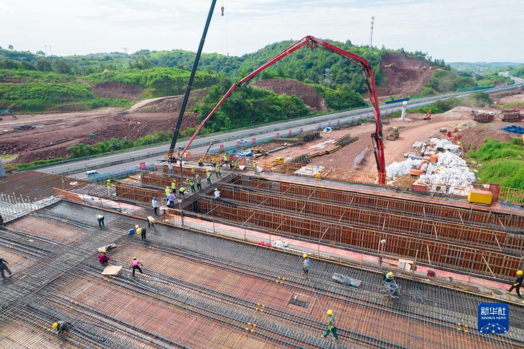 7月8日,在衡永高速祁东东枢纽互通娄衡跨线桥建设现场,泵车在运输混凝土(无人机照片)。