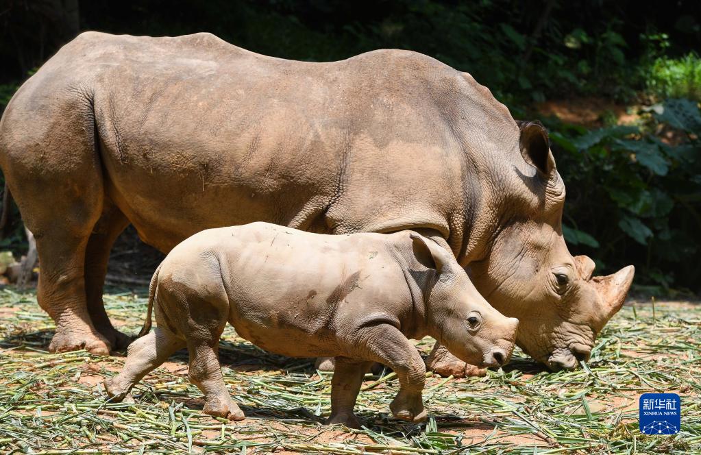 7月8日,广州长隆野生动物世界自驾游览区一只出生百日的白犀牛宝宝“西西”紧跟着妈妈“维维”。
