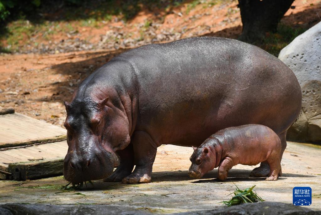 7月8日,广州长隆野生动物世界自驾游览区的河马宝宝紧跟着妈妈。