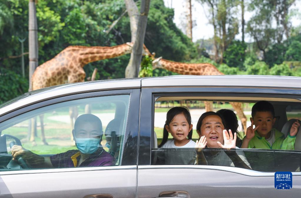 7月8日,游客在广州长隆野生动物世界自驾游览区近距离观察非洲草原动物。