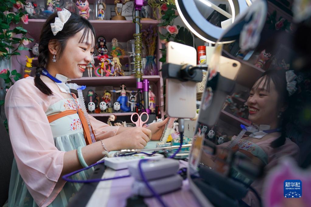 向晨曦在位于江苏无锡的出租屋内进行网络直播(6月14日摄)。