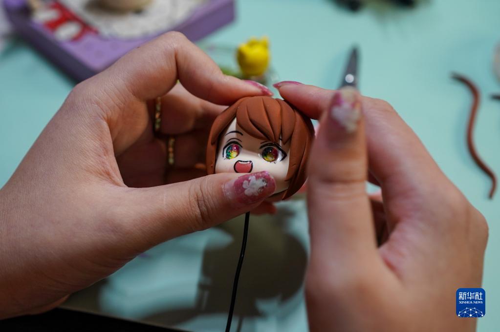 向晨曦在位于江苏无锡的出租屋内制作粘土手办(6月14日摄)。