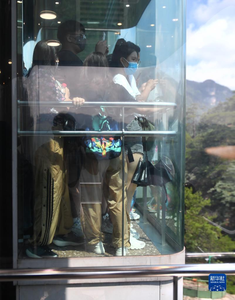 7月8日,游人乘百龙天梯在张家界市武陵源景区游玩。