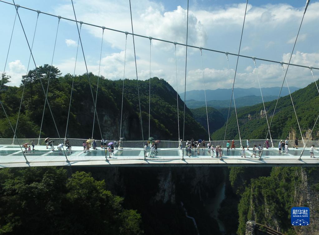 7月8日,游人在张家界大峡谷玻璃桥游玩(无人机照片)。