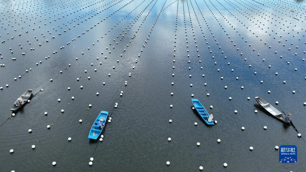 盛夏时节,在浙江省湖州市德清县龙胜村的小山漾淡水珍珠生态养殖基地,养殖户在水面上忙碌。近年来,德清县利用水资源优势,因地制宜调整养殖结构,引导农民养殖珍珠蚌,带动村民增收致富,助力乡村振兴。目前,全县淡水珍珠养殖约5000亩。
