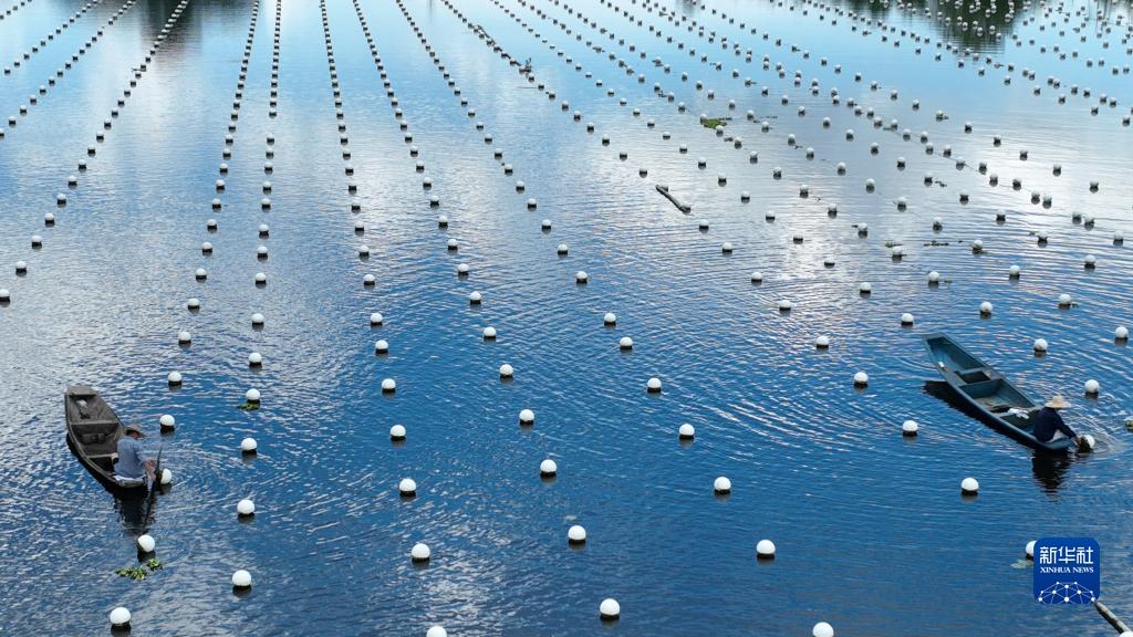 盛夏时节,在浙江省湖州市德清县龙胜村的小山漾淡水珍珠生态养殖基地,养殖户在水面上忙碌。近年来,德清县利用水资源优势,因地制宜调整养殖结构,引导农民养殖珍珠蚌,带动村民增收致富,助力乡村振兴。目前,全县淡水珍珠养殖约5000亩。