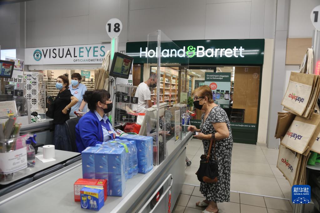 7月8日,人们佩戴口罩在塞浦路斯首都尼科西亚一家超市购物。