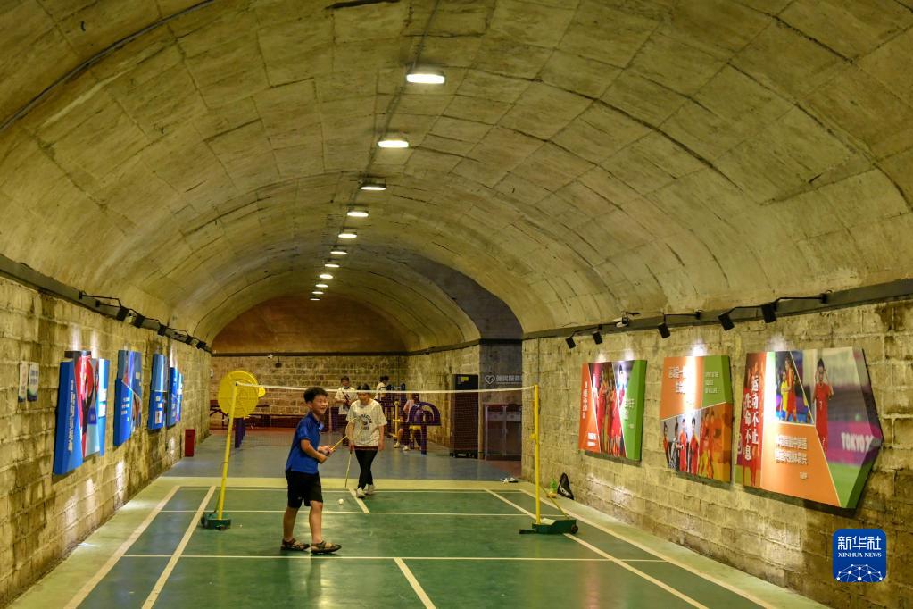 7月8日,居民在济南佛慧山人防工程避暑纳凉点内打羽毛球。