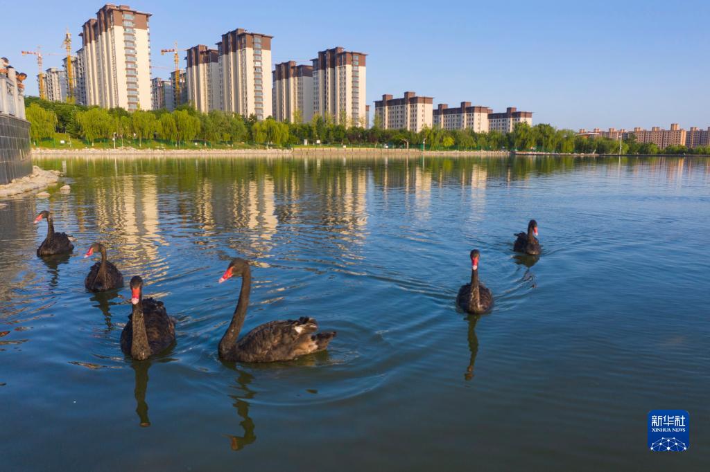 7月8日,黑天鹅在合阳县九龙湿地公园游弋。