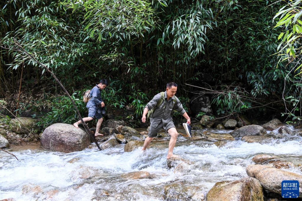 7月8日,潘礼全(右)和同事在保护区内巡护途中涉水过河。