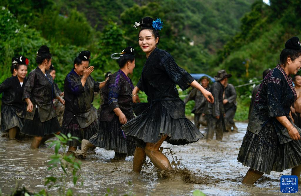 7月8日,剑河县仰阿莎街道大稿午村村民在表演水鼓舞。