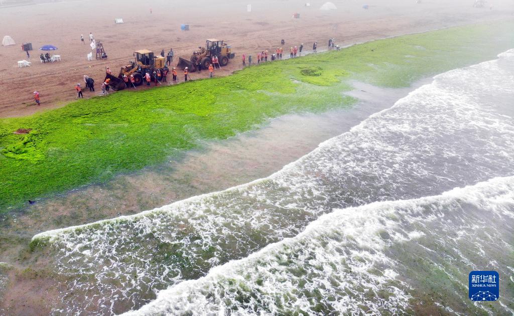 7月3日,环卫工作人员在山东省青岛市崂山区石老人海水浴场海滩上清理浒苔(无人机照片)。