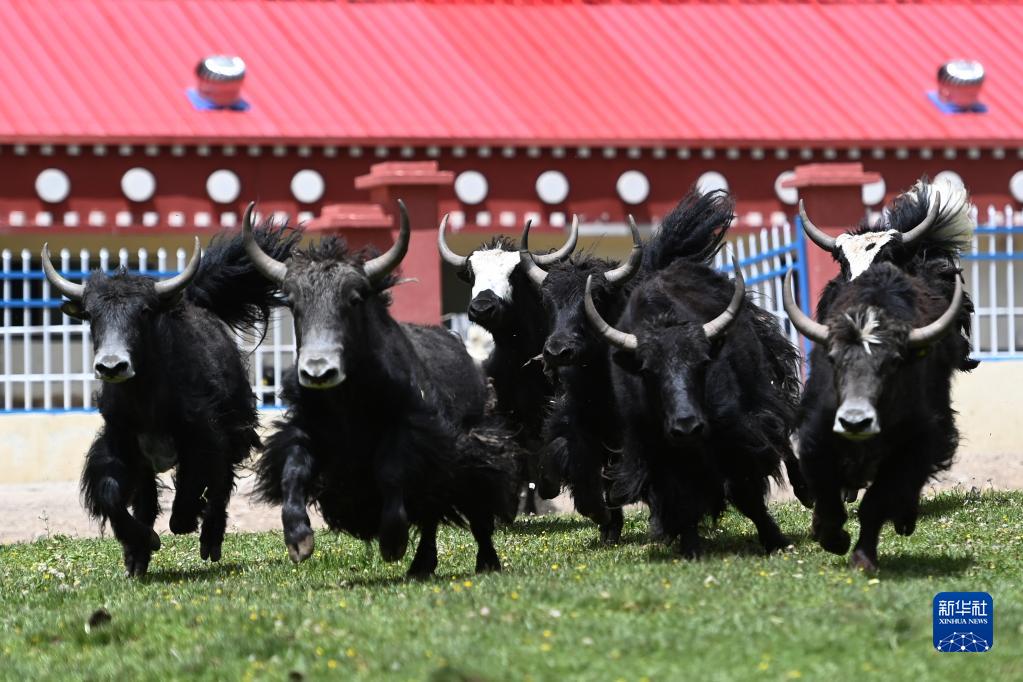 在青海省玉树藏族自治州称多县歇武镇牧业村的牦牛养殖基地,一群牦牛奔去河中饮水(7月4日摄)。